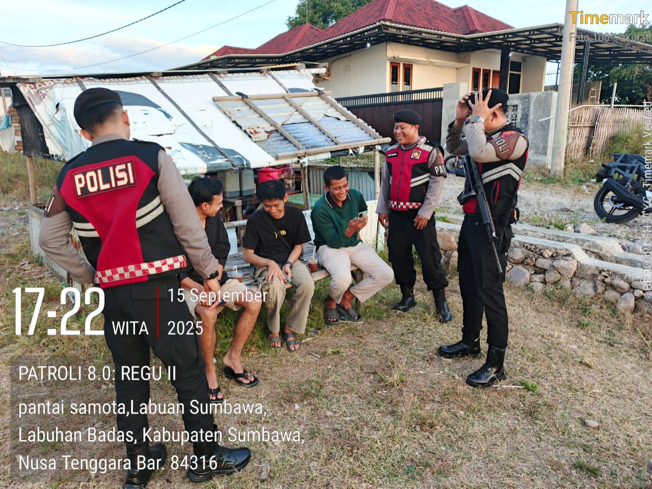 Sumbawa Besar, NTB — Satuan Samapta Polres Sumbawa terus mengintensifkan Kegiatan Rutin yang Ditingkatkan (KRYD) untuk menjaga keamanan dan ketertiban masyarakat (kamtibmas). Pada Senin, 15 September 2025, pukul 17.25 WITA, tim patroli yang dipimpin oleh Bripka Iskandar Sahdi bersama empat personel lainnya, yaitu Bripda Izzam Jaelani, Bripda Marwazi Thoriq, Bripda Putu Valintino Rossy, dan Bripda Kemas Manulang, melaksanakan patroli di wilayah Pantai Samota, Kecamatan Labuan Badas, Kabupaten Sumbawa.